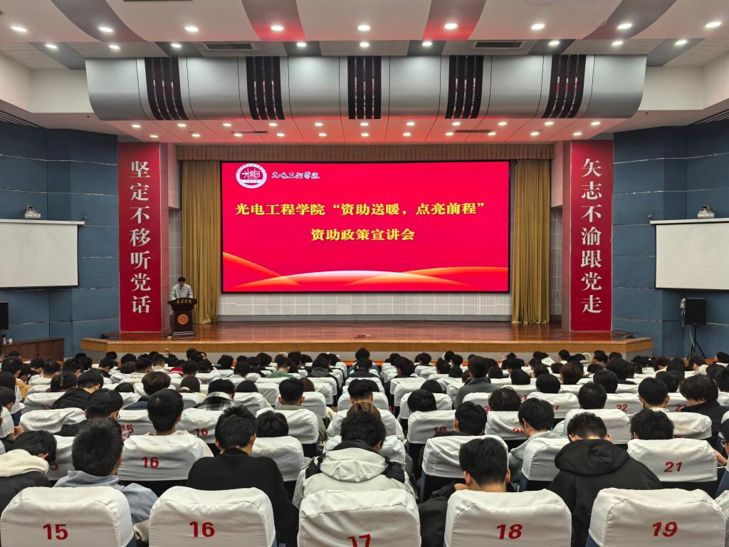 为进一步做好家庭经济困难学生的发展型资助工作,加强对学生的励志感恩教育、诚信教育,11月12日,光电工程学院在综合楼报告厅召开了“资助送暖,点亮前程”资助政策宣讲会。负责资助工作的宗兆星老师和全体25级新生参加此次活动。